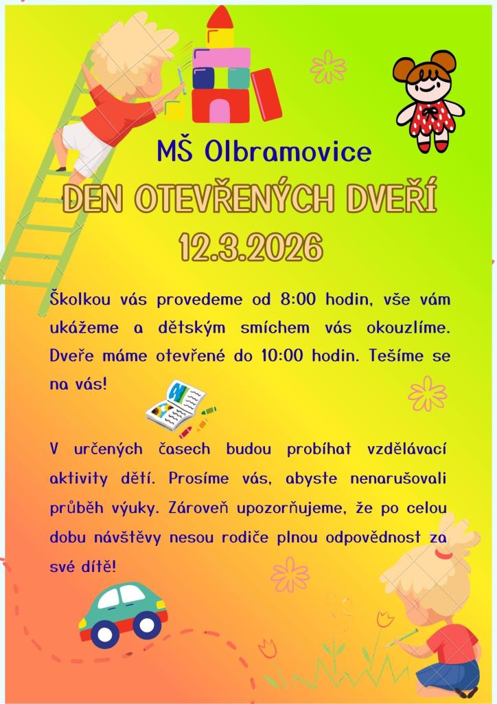 MŠ Olbramovice pořádá 12. března 2026 v době od 8:00 do 10:00 hod. Den otevřených dveří.