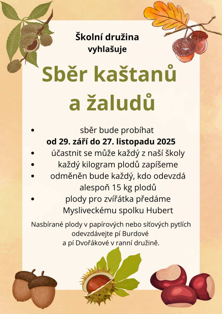 ŠD vyhlašuje sběr kaštanů a žaludů od 29. 9. 2025 do 27.11. 2025.