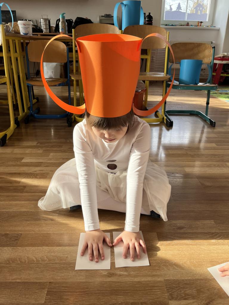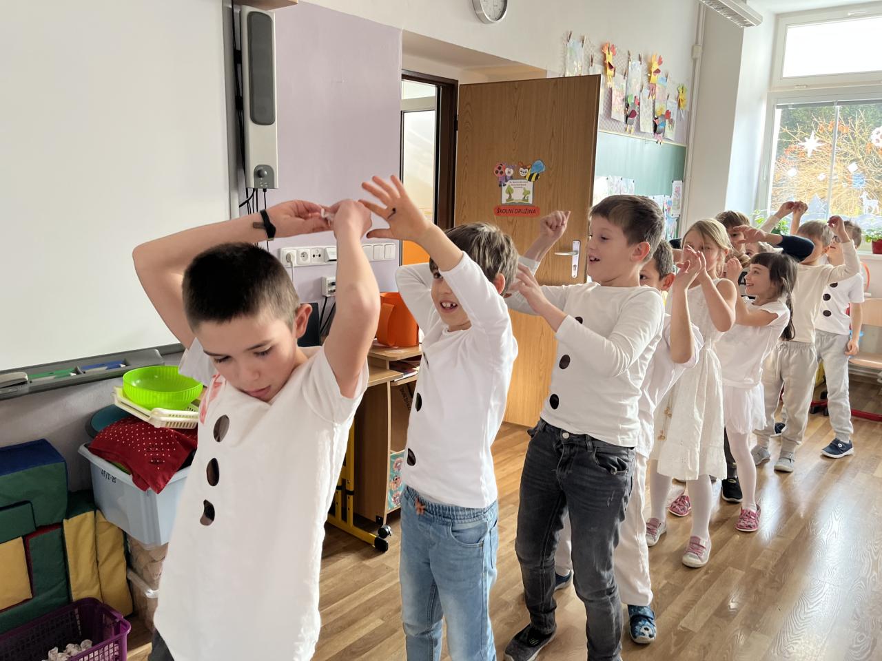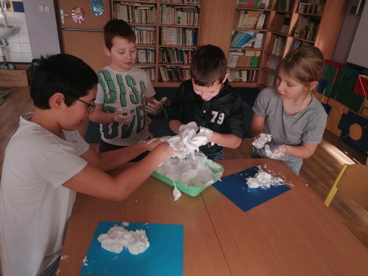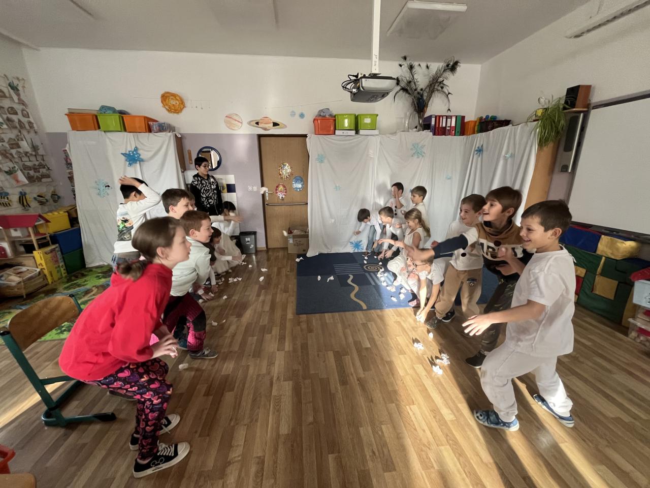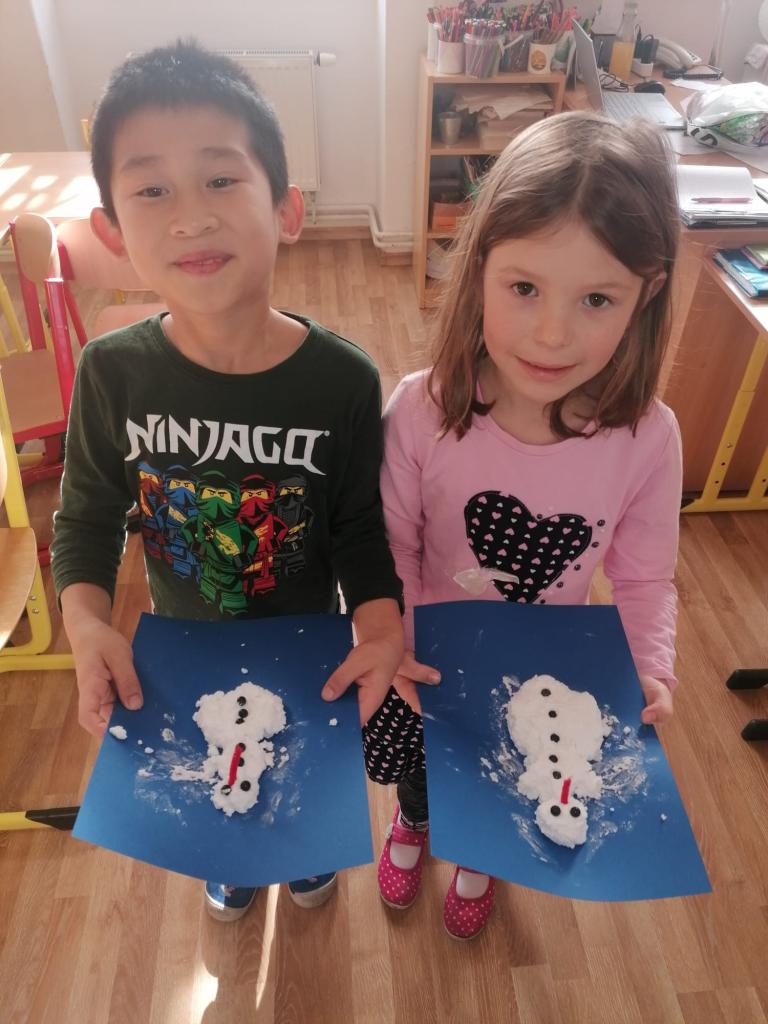 Nezbylo tedy nic jiného než si vyrobit sníh umělý a z něj vymodelovat alespoň malé sněhuláčky. Děti se také jedno odpoledne proměnily ve sněhuláčky a užily si zábavné odpoledne plné soutěží. Nakreslily a poskládaly spoustu krásných sněhuláků a vloček.