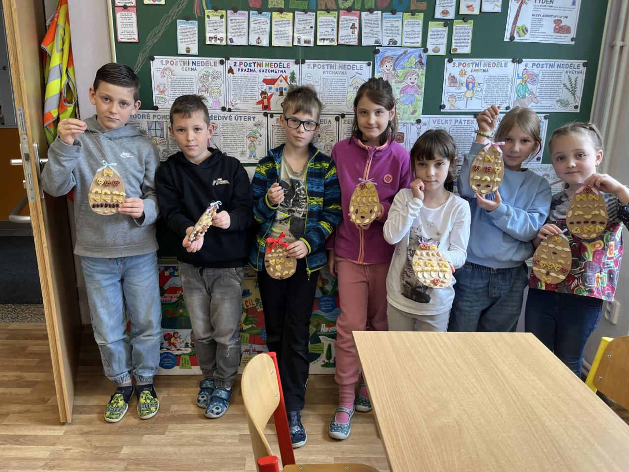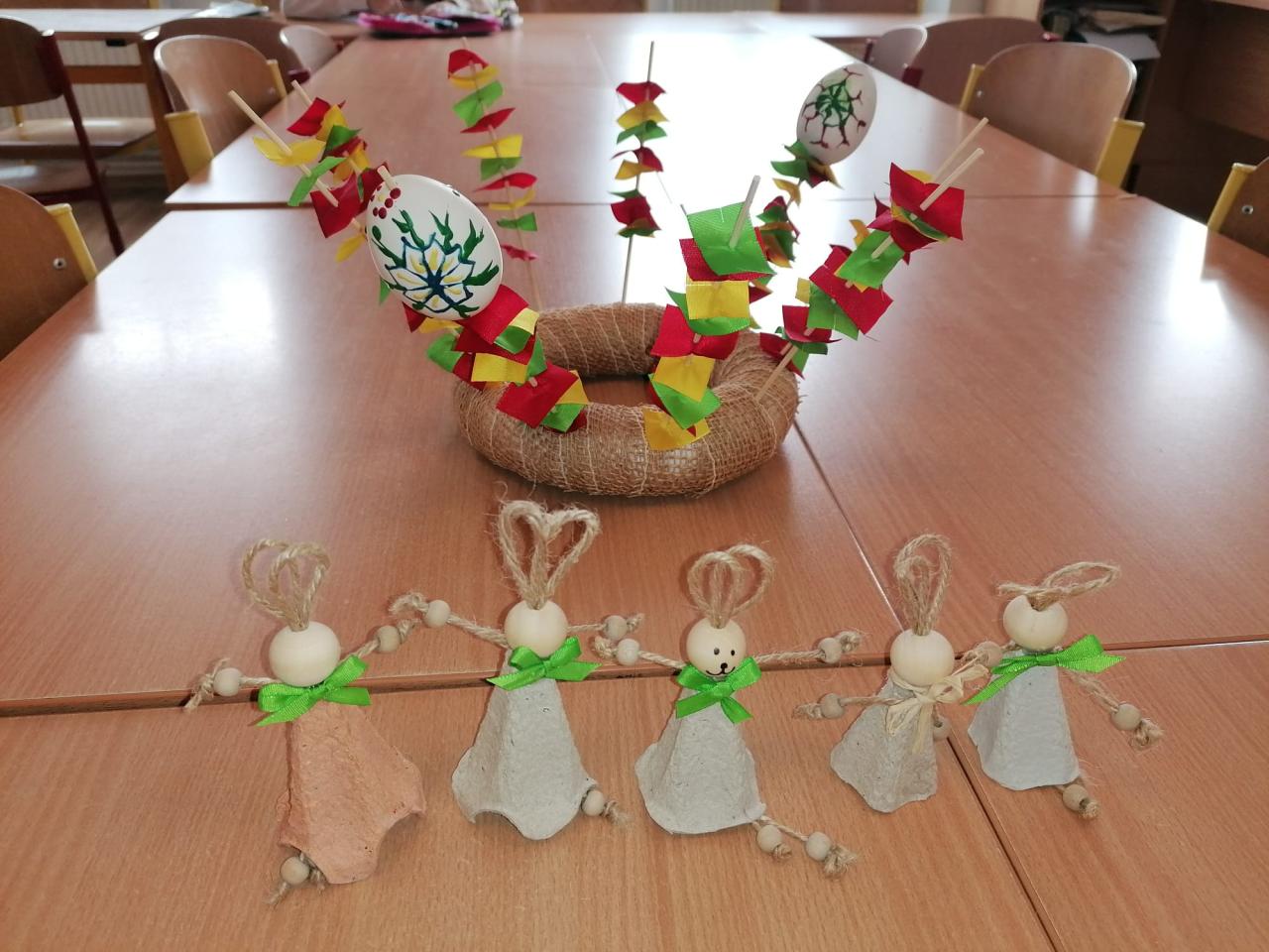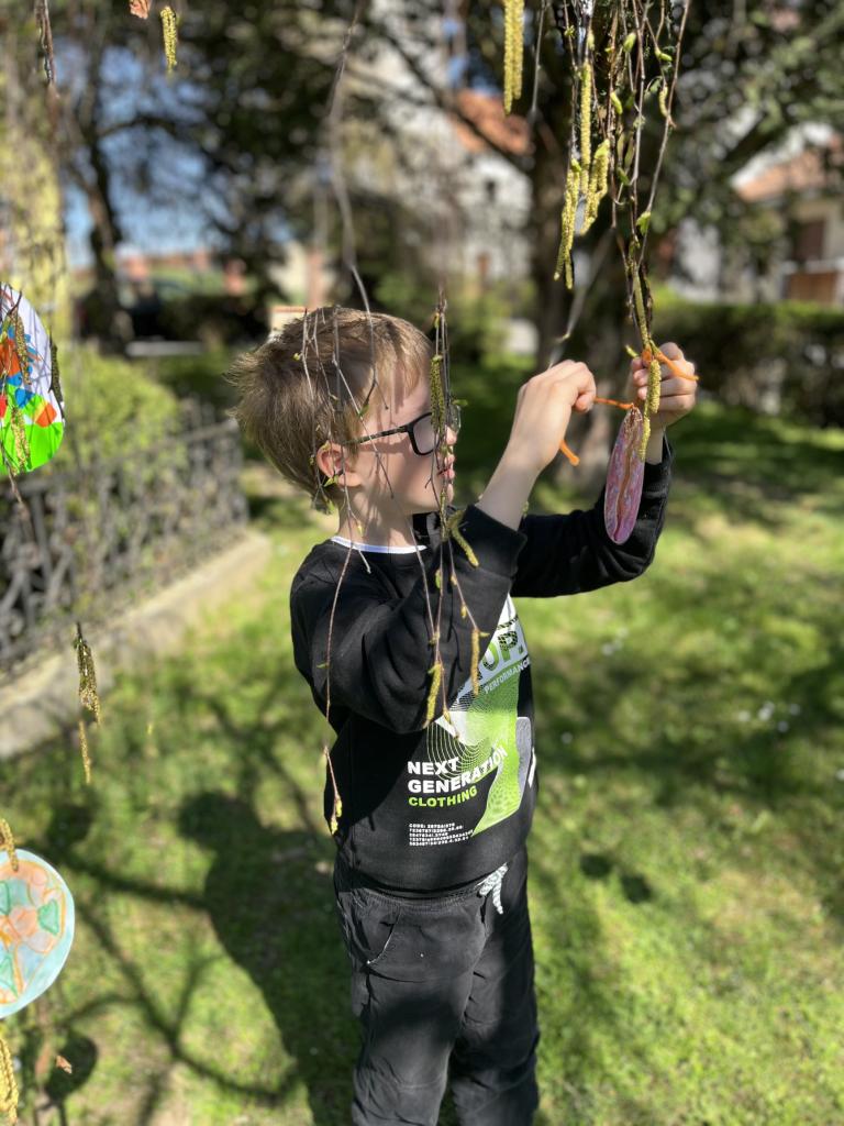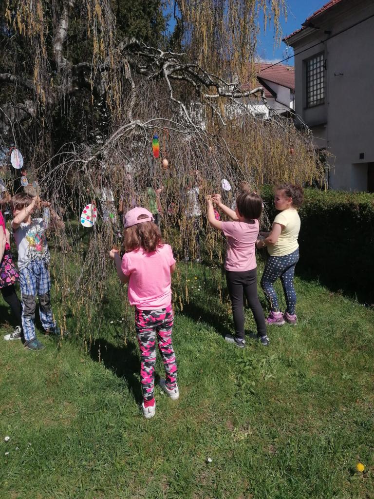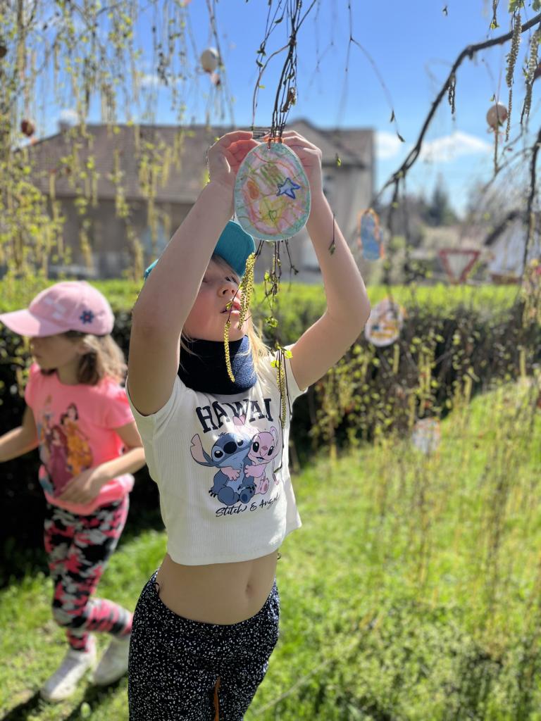 Děti vyráběly nejrůznější dekorace – kuřátka, zajíčky a malovaná vajíčka, dokonce i z těstovin! Společně jsme ozdobili strom před školou vlastnoručně vyrobenými vajíčky, které rozzářily celé okolí. Nechyběly ani jarní věnečky z pampelišek a tradiční pletení pomlázky. Všichni si vyzkoušeli velikonoční zvyky a přenesli se tak do atmosféry Velikonoc na venkově.
