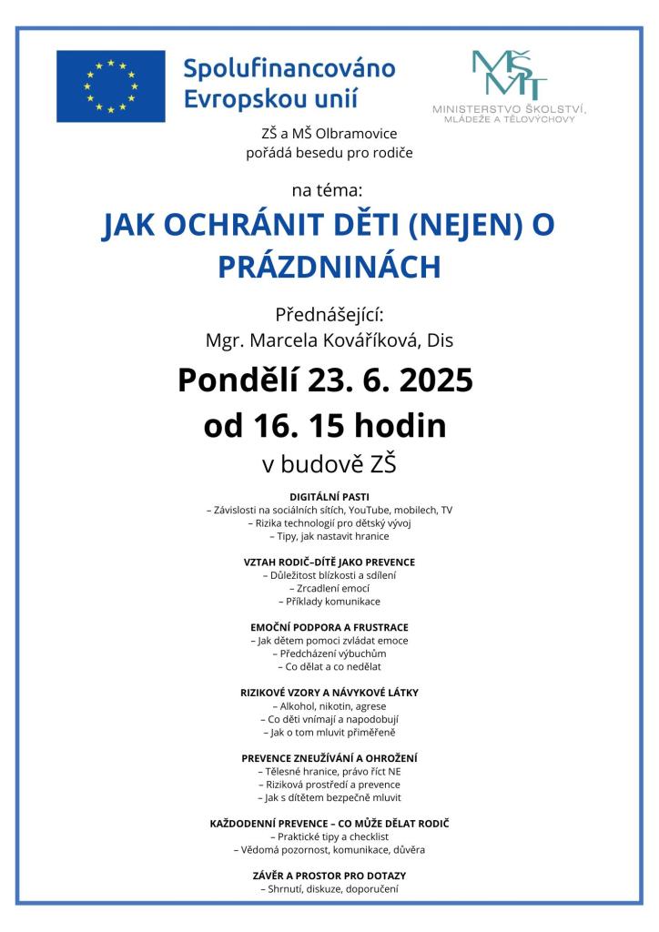 ZŠ a MŠ Olbramovice pořádá dne 23. 6. 2025 besedu na téma: Jak ochránit děti (nejen) o prázdninách. Přednášející Mgr. Marcela Kováříková, Dis.