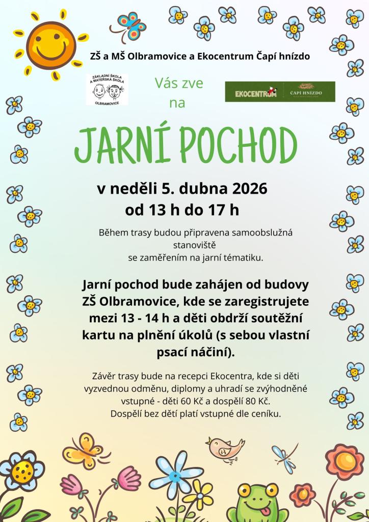 ZŠ Olbramovice a Ekocentrum Čapí hnízdo vás zve na Jarní pochod v neděli 5. 4. 2026. Začátek ve 13 h před budovou ZŠ.
