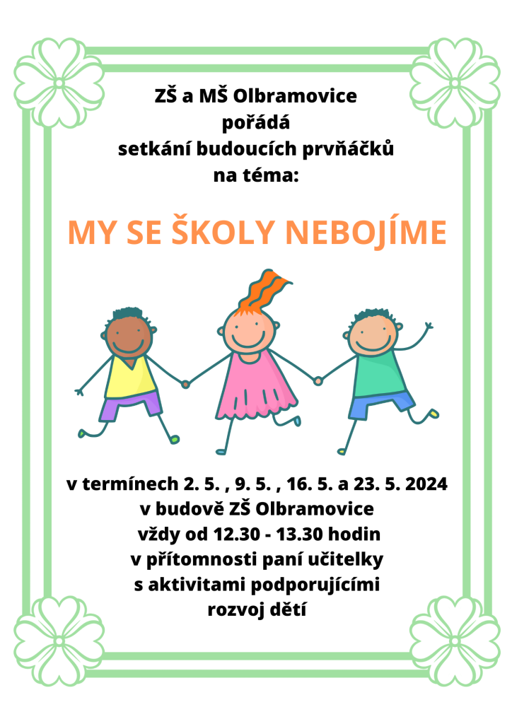 MY SE ŠKOLY NEBOJÍME - setkání budoucích prvňáčků ve dnech 2.5., 9.5., 16.5. a 23.5. 2024. Vždy od 12:30 do 13:30 hod. v budově ZŠ Olbramovice.