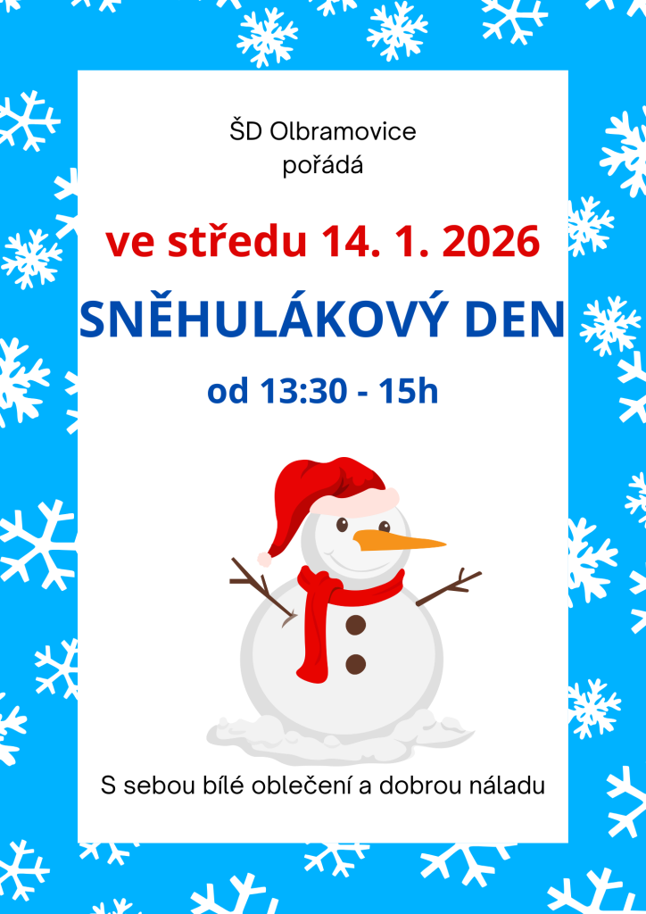 ŠD pořádá ve středu 14. 1. 2026 od 13:30 do 15h Sněhulákový den.