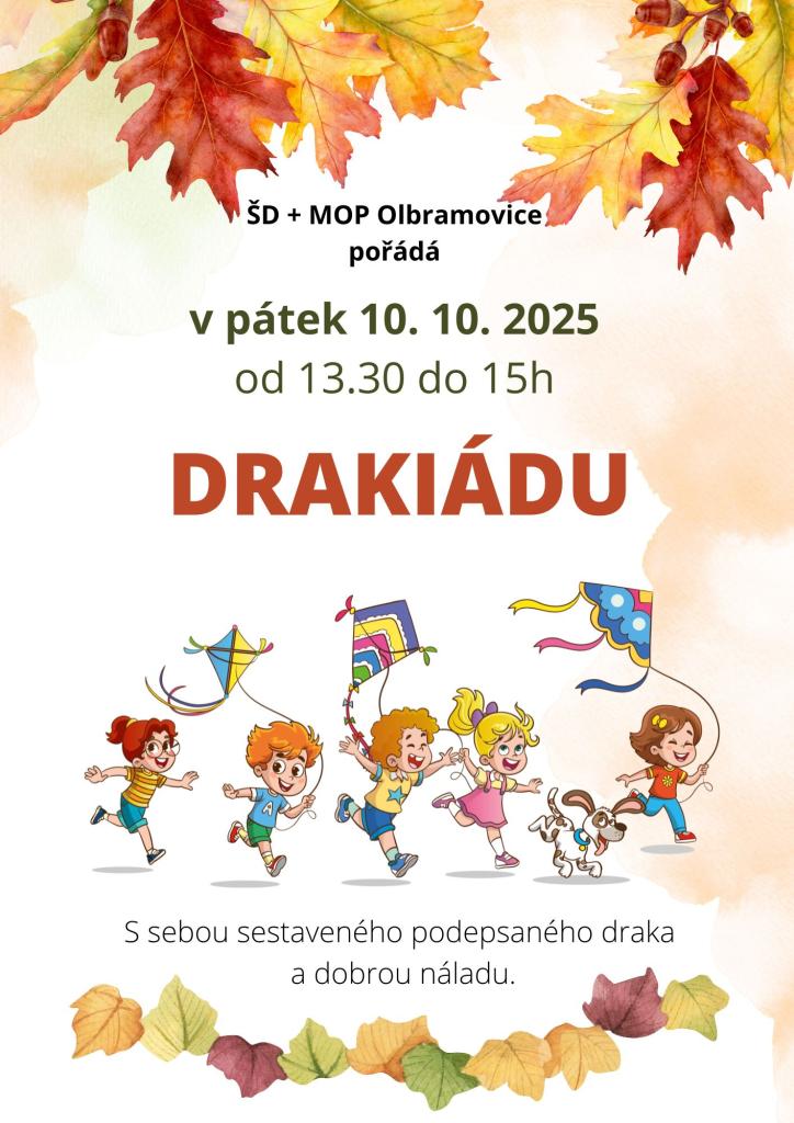 ŠD a kroužek MOP pořádají v pátek 10. 10. 2025 od 13:30 do 15h Drakiádu. S sebou podepsaného postaveného draka.